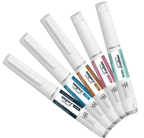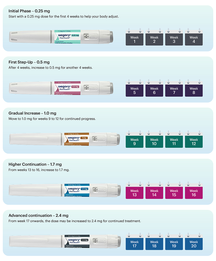 Wegovy comes in pre-filled pens with doses ranging from 0.25mg to 2.4mg. Treatment typically starts with the lowest dose, gradually increasing over several months. This allows your body to adjust and minimises side effects as you progress toward your weight loss goals.